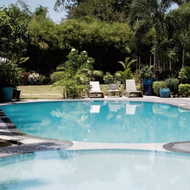 This beautifully landscaped outdoor pool is surrounded by lush gardens that are popular for weddings and other events.